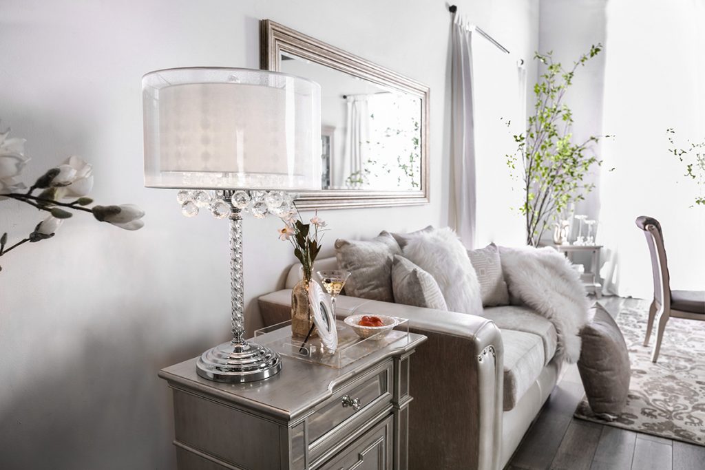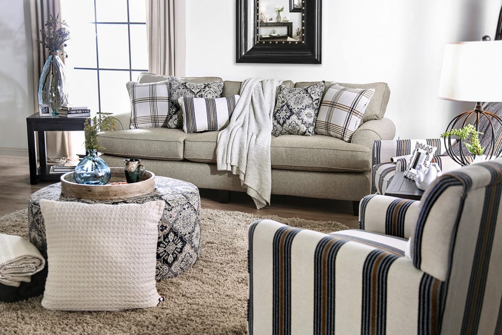 It’s also important to be mindful of consistency. A hodge-podge of colors, styles or design is rarely appealing. Take advantage of matching furniture collections to remove a lot of guesswork. For instance, an ensemble like the Bernadette living room collection (SM8200) is perfect with its matching patterns and neutral palette. Sets such as this create a sense of instant uniformity.